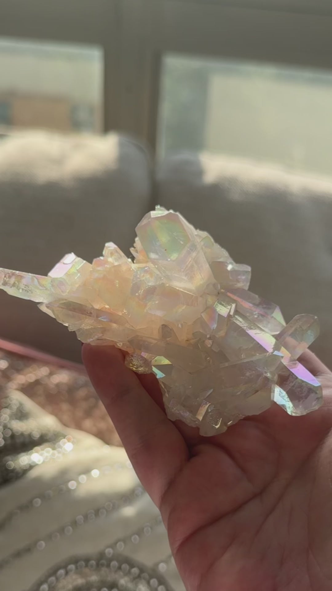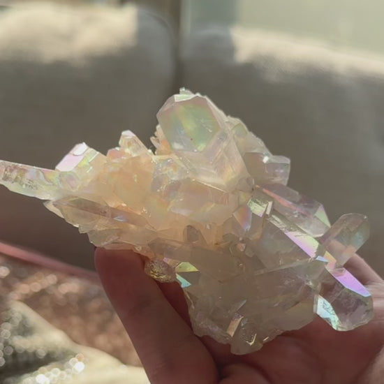This angel aura quartz cluster radiates soft rainbow light in every direction — a dreamy, iridescent piece perfect for display or energy work. Ethereal in appearance and calming in energy, she brings peace, mental clarity, and a luminous vibe to your space.
