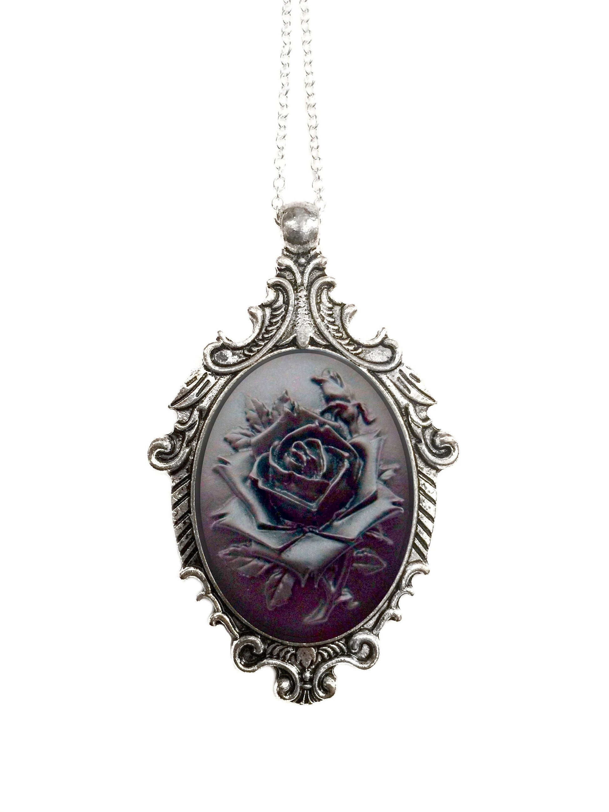 Black and Black Rose Cameo Necklace - Vintage Black Silver Ornate Pendant