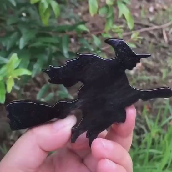 Black Obsidian Witch Crystal Carving, Halloween Goddess Riding Broom Figurine Statue