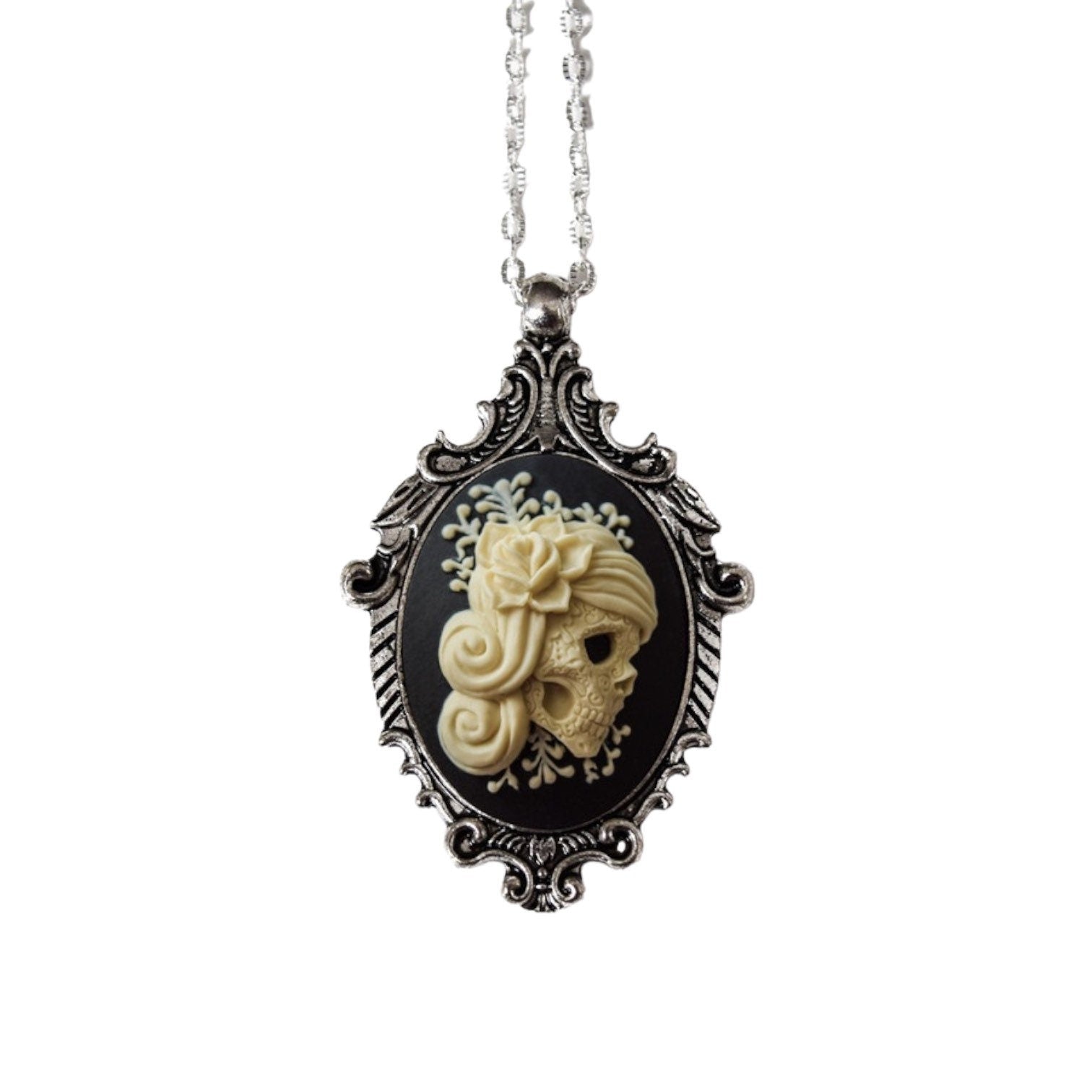 Cream and Black Vintage Lady Skull Cameo Necklace, Victorian Ornate Antique Silver Pendant