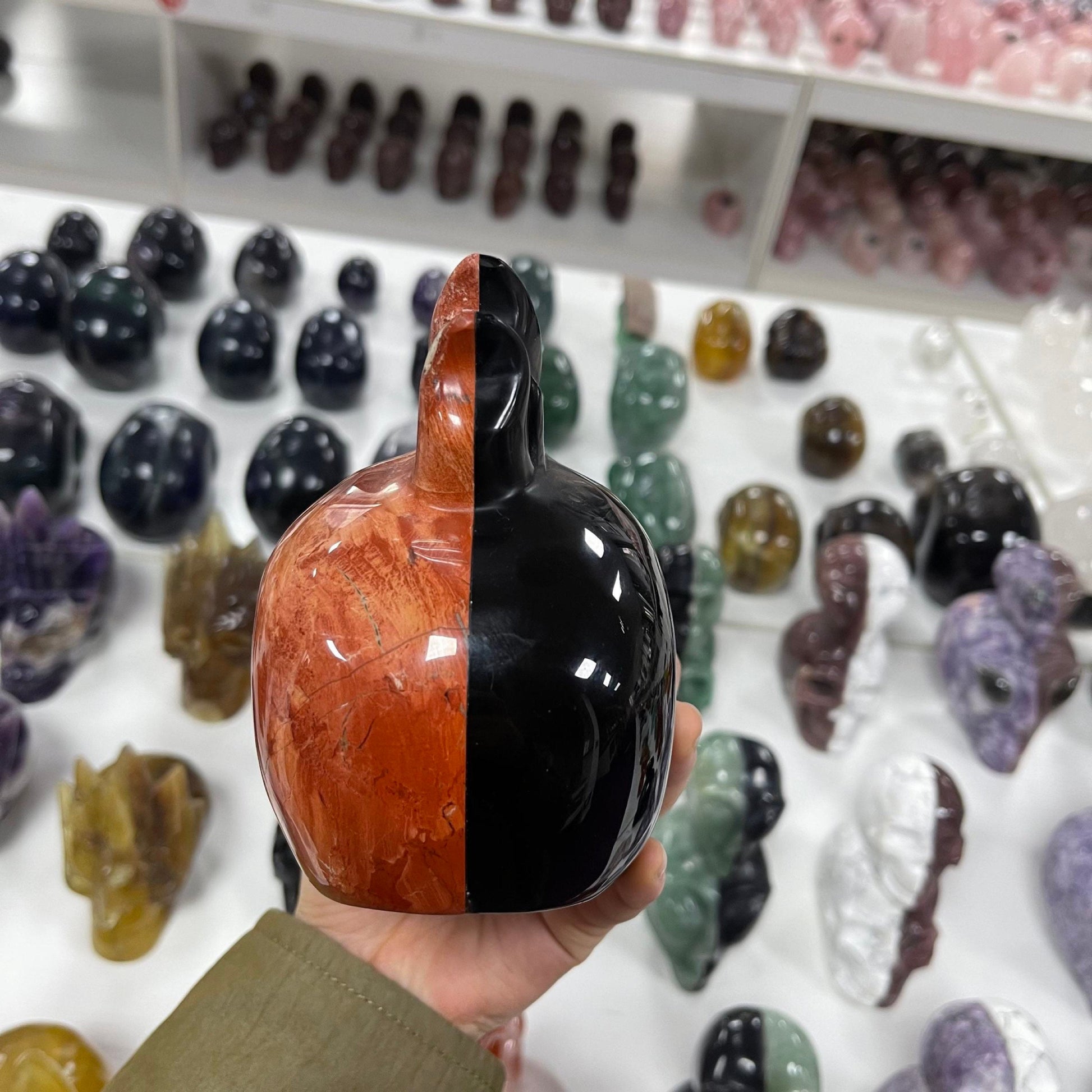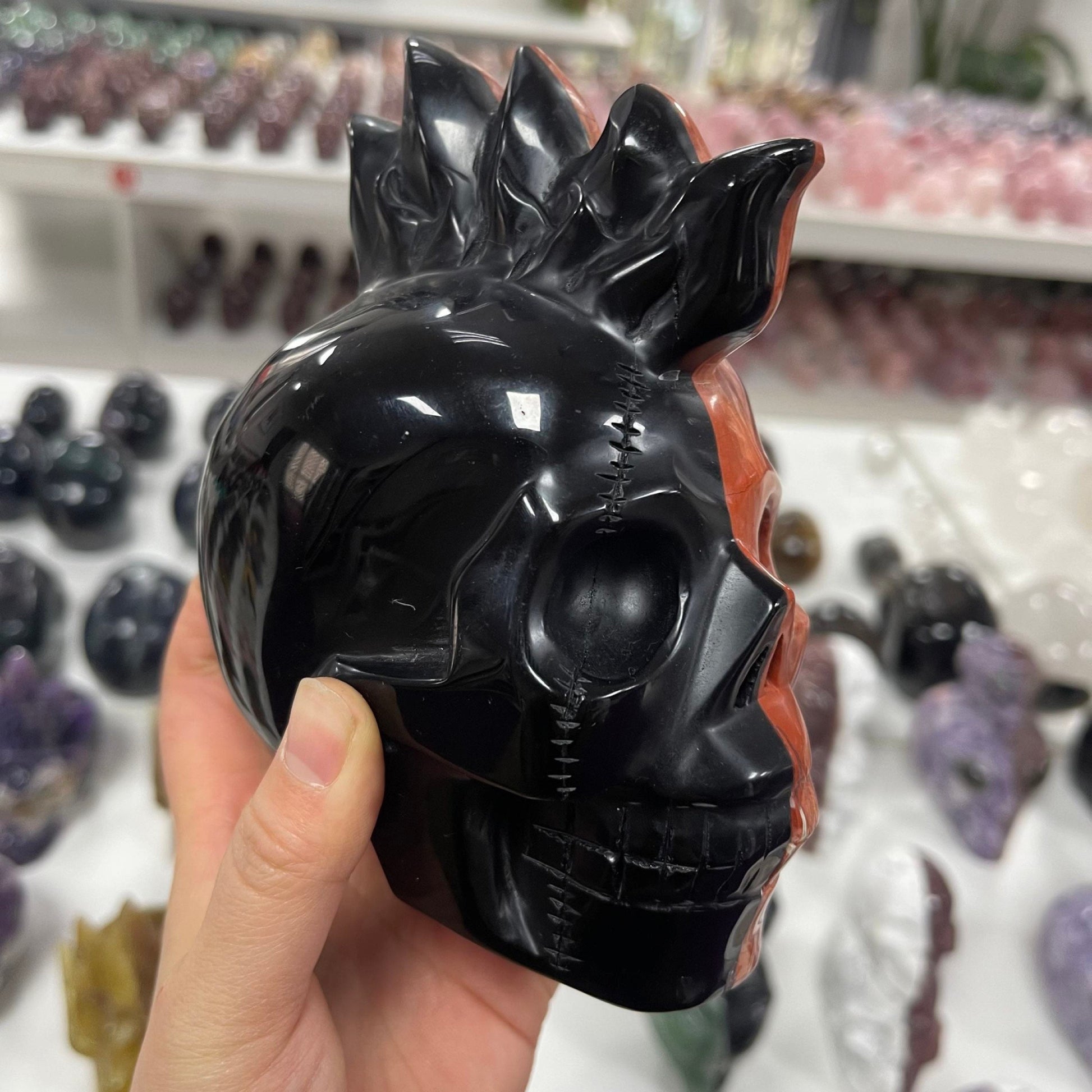Large Obsidian Red Jasper Skull - Hand Carved Two Tone Flame Design for Meditation Witchy Decor