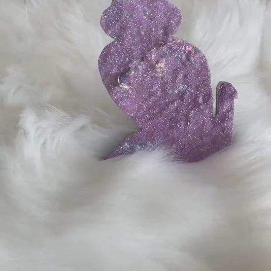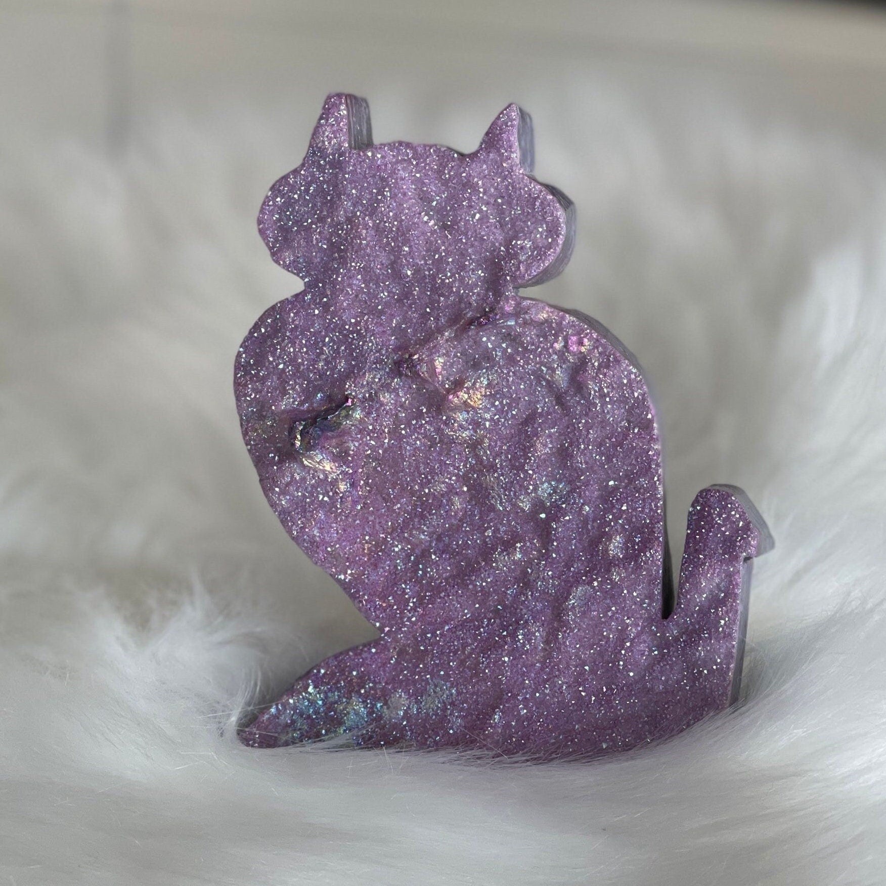 This Sphalerite Crystal Cat is a beautiful, and rare statement piece. Accented with an iridescent coating of Aura, the sphalerite druzy crystals present a soft purple hue with rainbow flashes of sparkle!