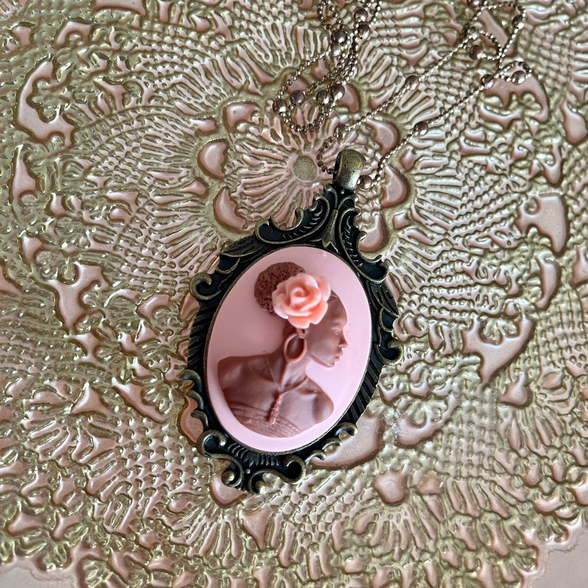 The cameo features an elegant African goddess in a rich brown tone on a soft pink resin background, with a sweet acrylic rose delicately added to her hair — a unique touch that makes this piece truly special.