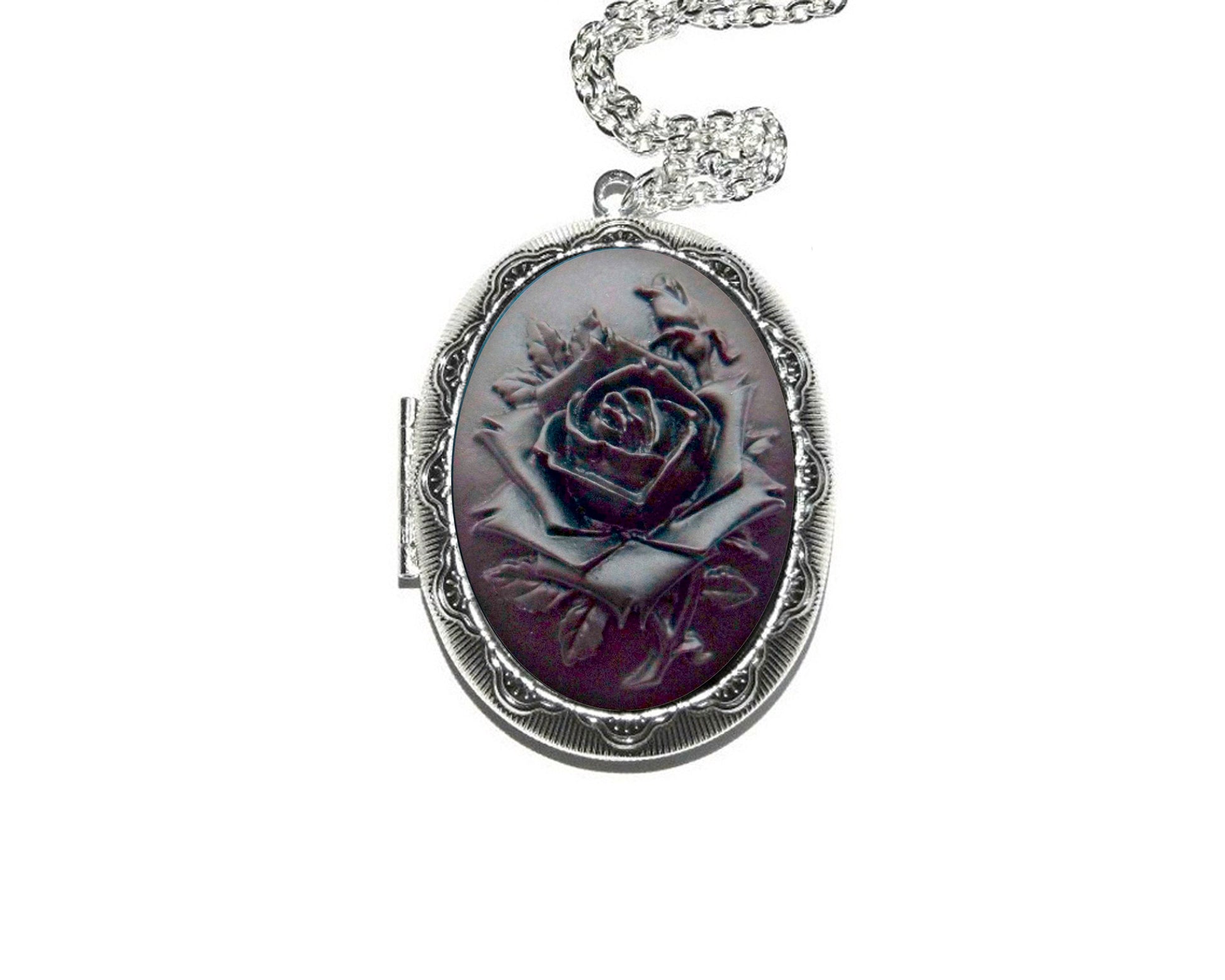 Vintage Black Rose Cameo Locket Necklace - Silver Pendant