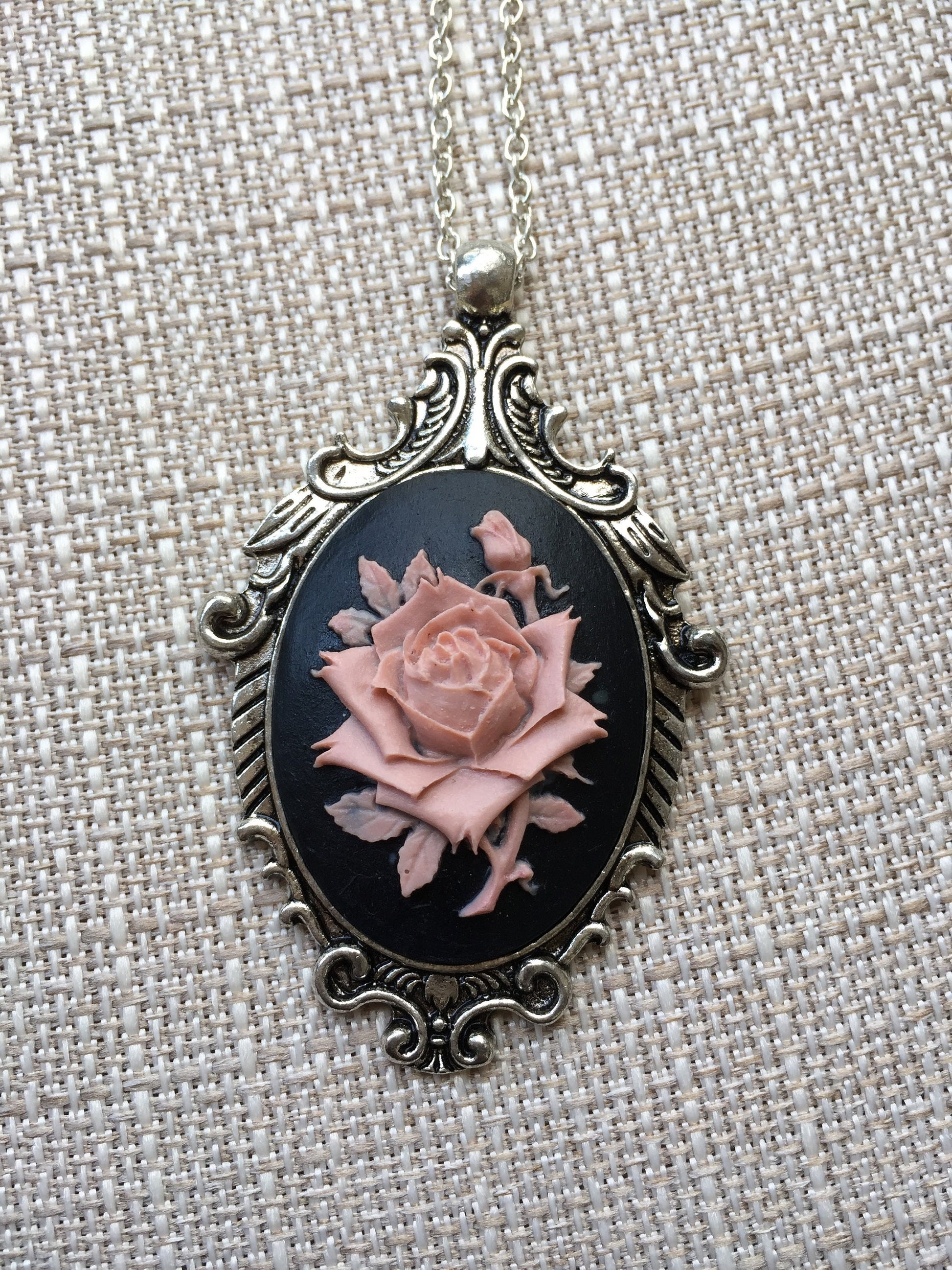 Vintage Mauve Pink and Black Rose Cameo Necklace with Ornate Antique Silver Pendant